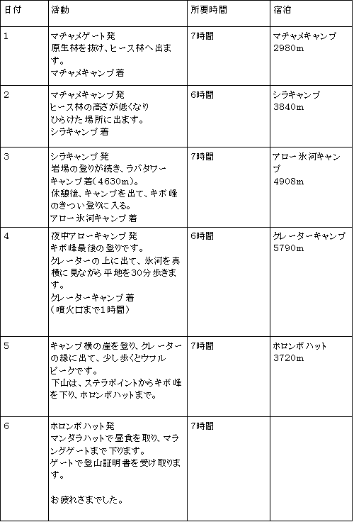 値段に含まれるものは: 公園入園料、キャンプ場使用料、レスキュー料、食事、テントレンタル代(一人一張り)、テーブル・椅子レンタル代、寝袋、ミネラルウォーター一日一本、ガイド・ポーターへの給料 値段に含まれないものは: 登山前後の宿、キリマンジャロゲート送迎、登山用具レンタル代(マットレス含む)、ガイド・ポーターへのチップ、旅行保険 *上記の値段は参考料金です。 ご相談次第でサービス内容を変更して、価格を上下出来ます。 お気軽に日本語でお問い合わせください。